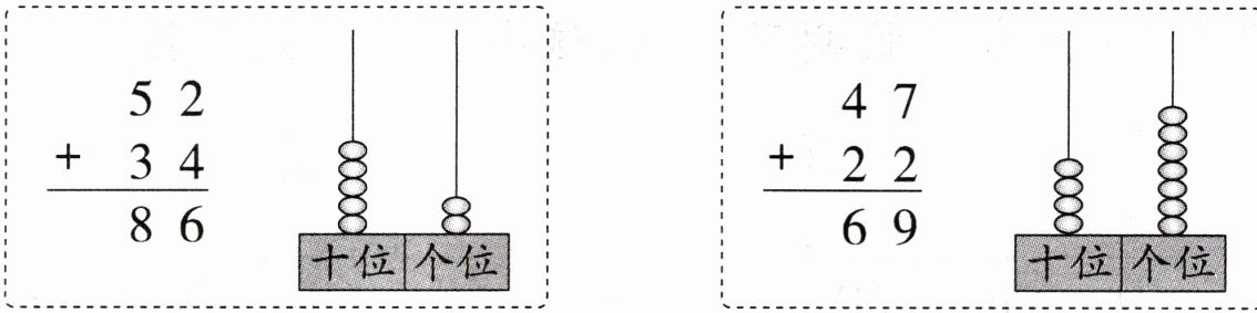 1. 根据竖式,在计数器上继续画珠子表示计算过程。