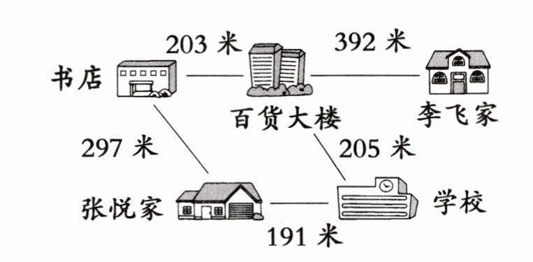 (1)张悦从家出发,经过书店、百货大楼到达李飞家,大约要走多少米?