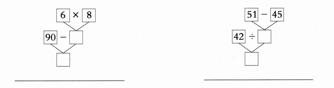 $2 × 9 ÷ 3$ $50 - 30 ÷ 5$ $63 - (43 - 18)$