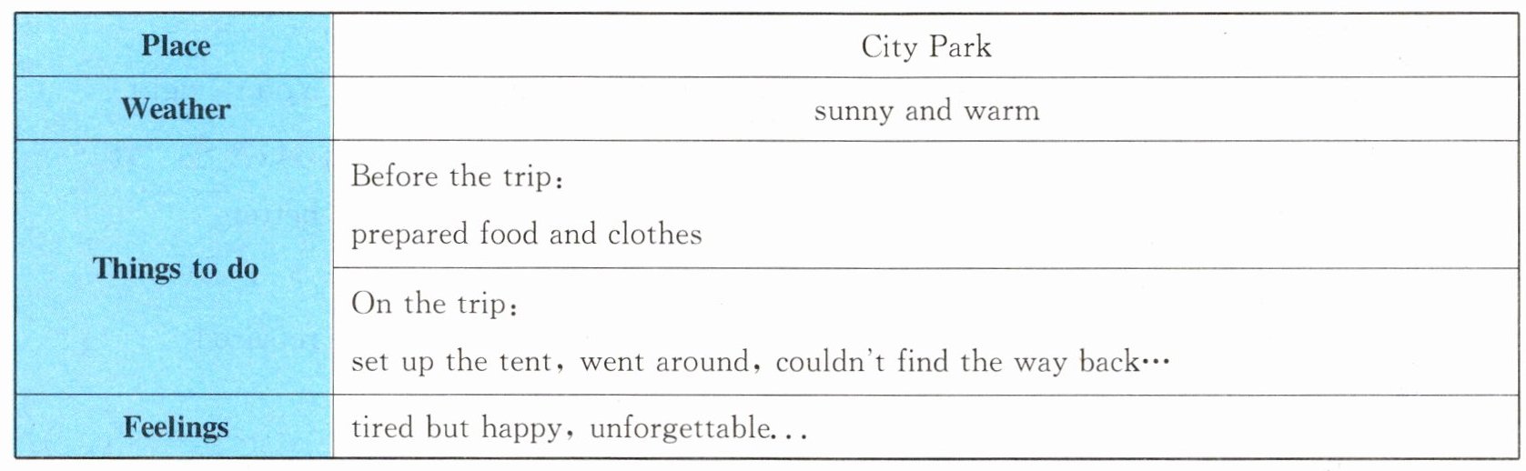 Before the trip, we prepared lots of food and right clothes. When we arrived at the park, we set up the tent and went around for fun. We saw many trees and heard some birds singing. When we wanted to go back, we couldn't find the way. My father took out a map and we followed it. Finally, we returned to our tent safely.