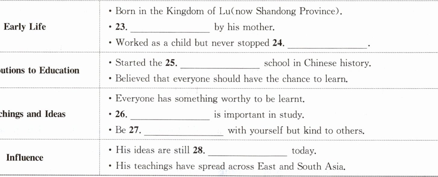 23. Raised 24. studying 25. first public 26. Thinking 27. strict 28. followed 29—32 BBAC 33. Confucius started the first public school in Chinese history. At that time, only children from noble families could go to school, but Confucius believed everyone should have the chance to learn. This idea changed education forever and made it possible for ordinary people to study and improve their lives. (答案不唯一, 言之有理即可)