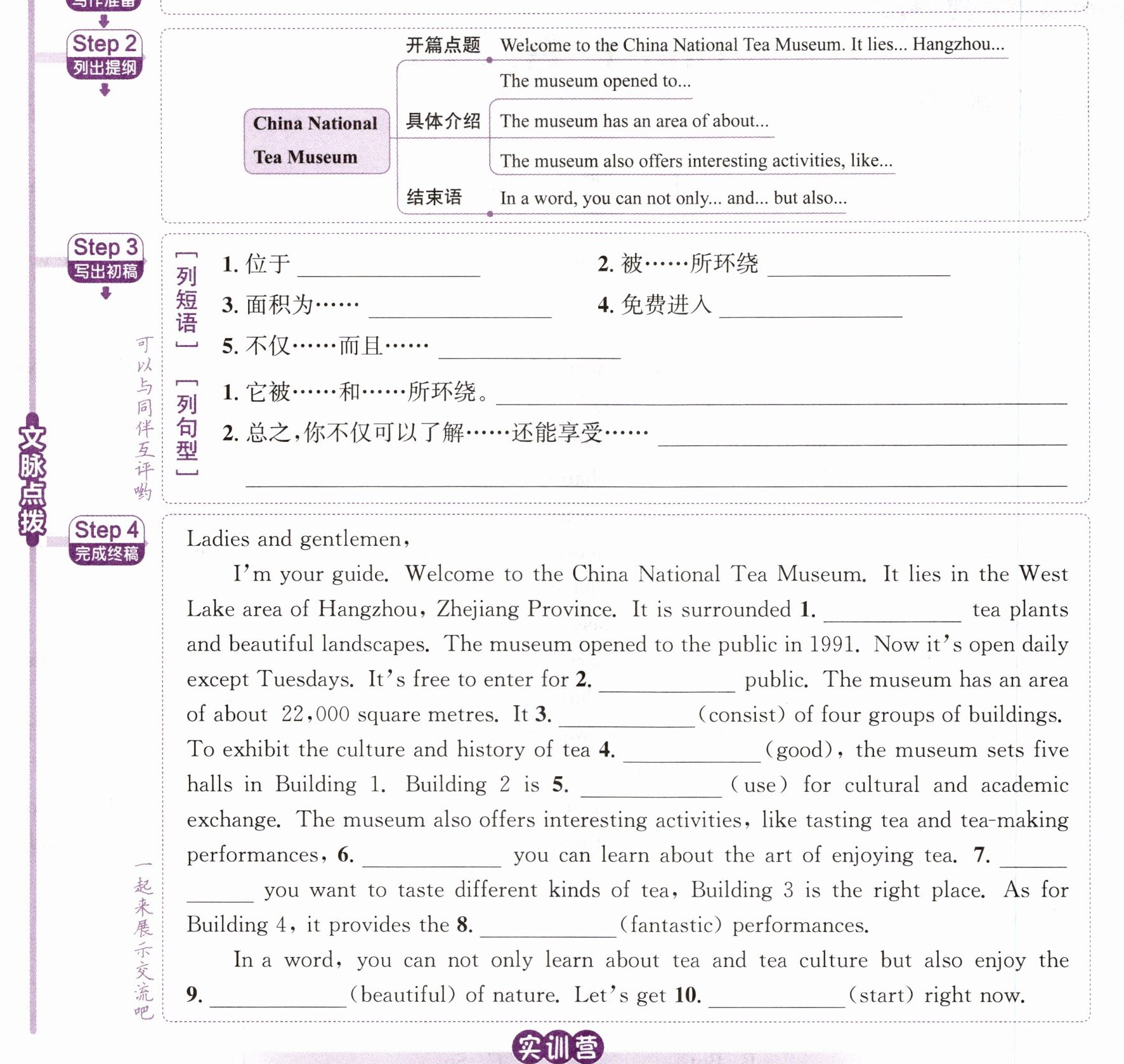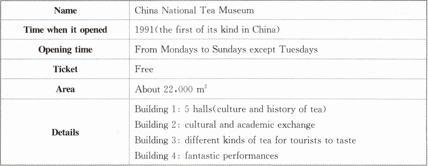 22,000 square metres. It 3. consists (consist) of four groups of buildings. To exhibit the culture and history of tea 4. well (good), the museum sets five halls in Building 1. Building 2 is 5. used (use) for cultural and academic exchange. The museum also offers interesting activities, like tasting tea and tea-making performances, 6. where you can learn about the art of enjoying tea. 7. If you want to taste different kinds of tea, Building 3 is the right place. As for Building 4, it provides the 8. most fantastic (fantastic) performances. In a word, you can not only learn about tea and tea culture but also enjoy the 9. beauty (beautiful) of nature. Let’s get 10. started (start) right now.