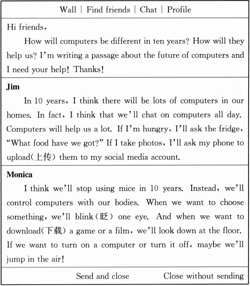 In 10 years, I think there will be lots of computers in our homes. In fact, I think that we’ll chat on computers all day. Computers will help us a lot. If I’m hungry, I’ll ask the fridge, “What food have we got?” If I take photos, I’ll ask my phone to upload(上传) them to my social media account.