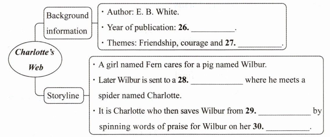 26. 1952 27. love 28. new farm 29. being killed 30. web 31—34 AABC 35. Pride and Prejudice by Jane Austen tells the story of Elizabeth Bennet, a spirited young woman, and Mr Darcy, a wealthy but proud gentleman. Misunderstandings and societal pressures test their romance, leading to a tale of love, growth and self-discovery. (答案不唯一,言之有理即可) 36. And she realises that if she stands up for what she believes in, she can make a difference in the world. (答案不唯一,言之有理即可)