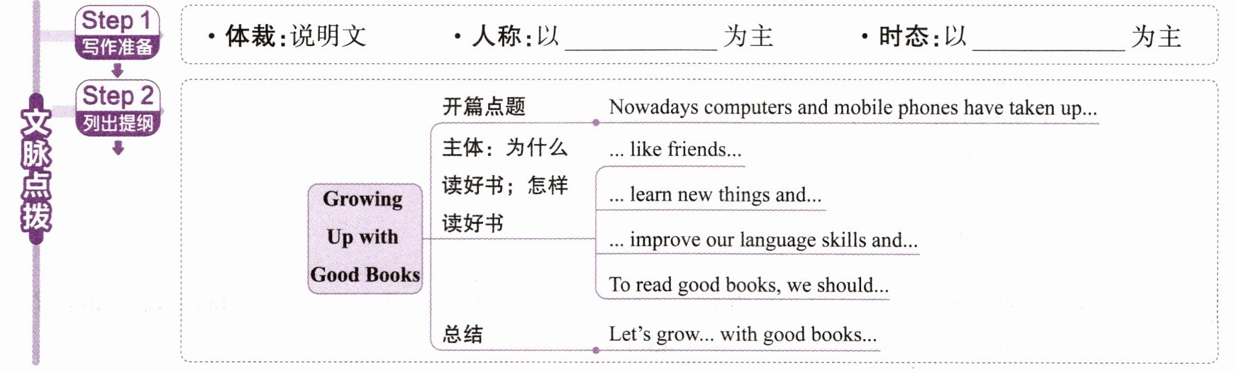 高尔基说:"书籍是人类进步的阶梯。"冰心说:"读书好,好读书,读好书。"在这个科技和信息高速发展的时代,手机、电脑占据了人们的业余时间。读一本好书变得越来越难了。好书会带给我们什么? 中学生为什么要读好书? 我们要怎样读好书? 请你以"Growing Up with Good Books"为题,写一篇 90 词左右的英语短文。