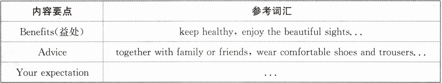 假设你是李华,你校体育社团发起了"徒步旅行"的主题活动,想让大家在运动中收获快乐和成长。作为体育社团的一员,请你根据下面表格中的内容要点,用英文写一篇发言稿。
