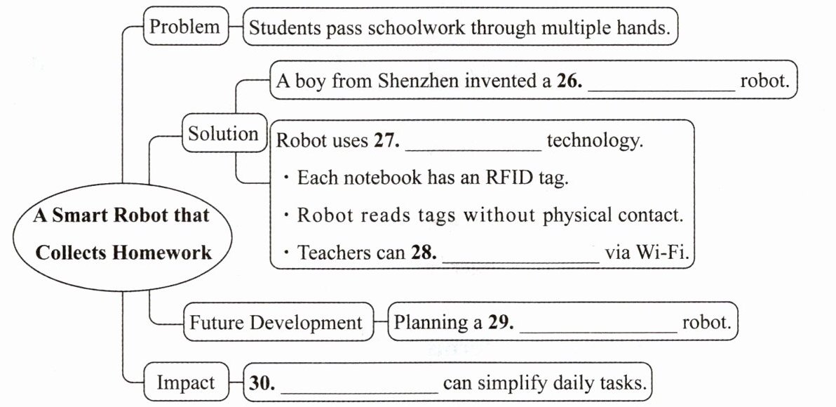 33. The writer writes this passage to introduce a smart homework collection robot invented by a student, explaining how it solves the problem of collecting homework and can make life easier. (答案不唯一, 言之有理即可)