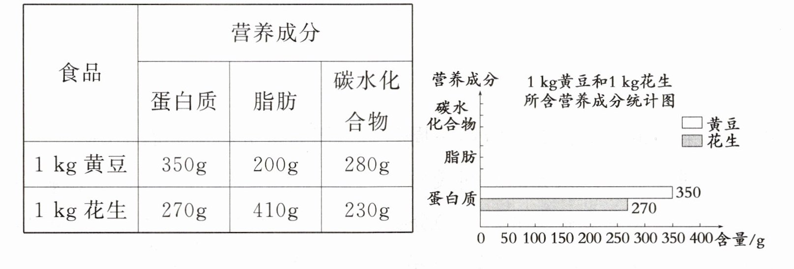 1. 据营养学专家介绍,1kg 黄豆和 1kg 花生所含营养成分如下表。