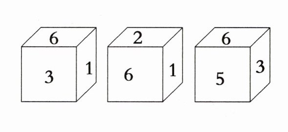 2. 有一个正方体,每个面上分别写着1、2、3、4、5、6,从不同方向观察到的数字如下,这个正方体相对两个面的数字各是几?