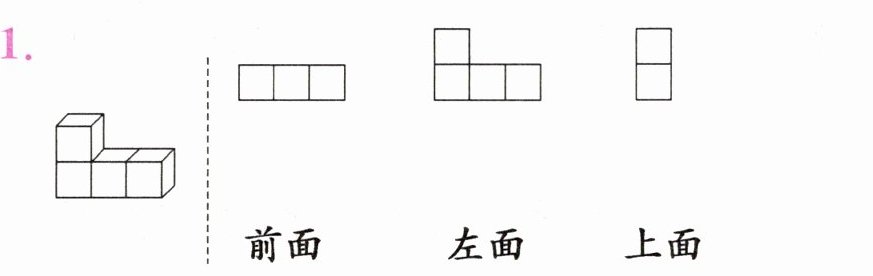 1. 用6个大小相同的小正方体搭建成的物体,从上面看到的图形如下图所示,你能画出从前面看,所有可能看到的图形吗?