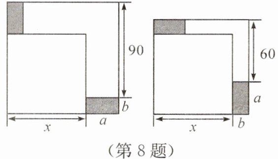 8. 如图,边长为$x的两个正方形靠边各放置两个邻边长为a$,$b$的长方形,然后分别以$a+x$,$b+x$为边长构成两个大正方形.根据图中数据可求得$x$的值为()