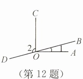 12. 如图,$\angle 1= 15^{\circ}$,$\angle AOC= 90^{\circ}$.若点$B$,$O$,$D$在同一条直线上,则$\angle 2= $______.