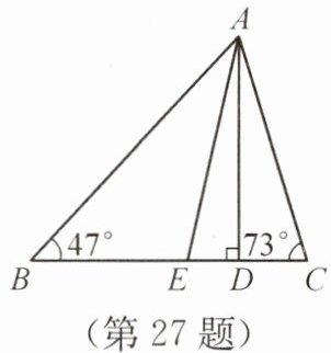 27. 如图,AD是$△ABC$的BC边上的高,AE是$∠BAC$的平分线,若$∠B= 47^{\circ },∠C= 73^{\circ }$,则$∠DAE= $____度.
