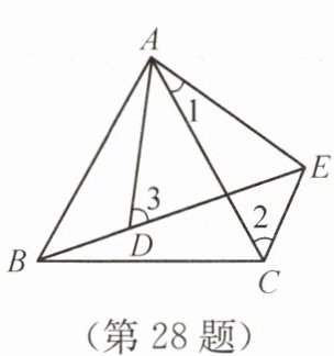 28. 如图,$AB= AC,BD= CE,∠ABD= ∠2,∠1= 25^{\circ },∠2= 30^{\circ }$,则$∠3= $____.