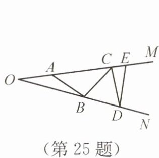 25. 如图,在$∠MON$的两边上顺次取点. 使$DE= CD= BC= AB= OA$,若$∠MON= 22^{\circ }$,则$∠NDE= $____.