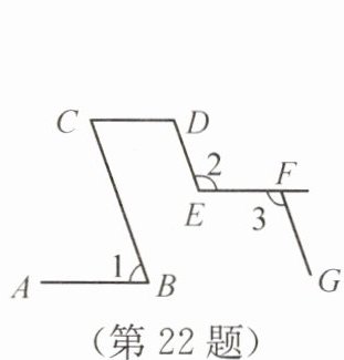 22. 如图,$AB// CD// EF,CB// DE// FG$,若$∠1= 70^{\circ }$,则$∠2= $____,$∠3= $____.