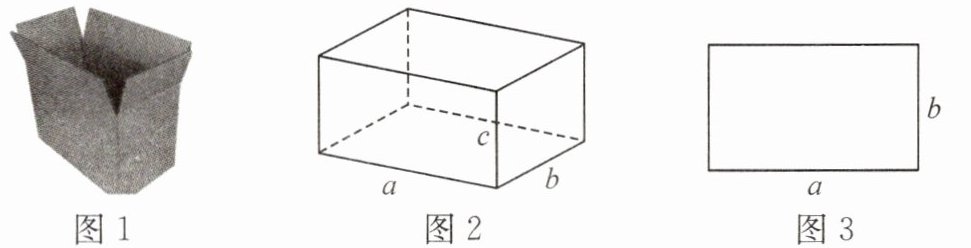 (1) 若 $a > b > c$,以图 2 的下底面为底面,用两个同样的小包装盒搭成一个大长方体.