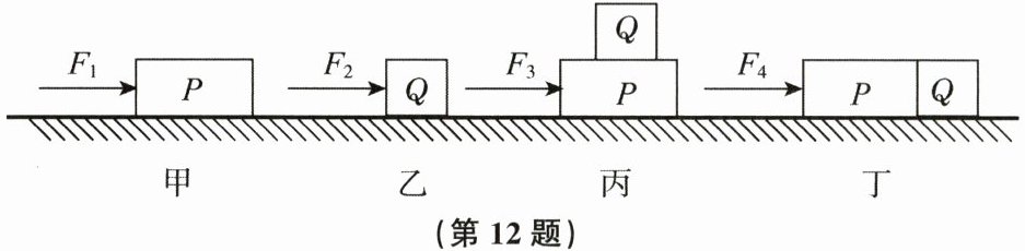 $12. $如图所示$,$在同一水平面上$,$将两个表面粗糙程度相同、质量不同$(m_P>m_Q)$的长方体铁块$P、$$Q$按照甲、乙、丙、丁四种方式放置$,$使其分别在水平力$F_1、$$F_2、$$F_3、$$F_4$的作用下做匀速直线运动。则$ ($