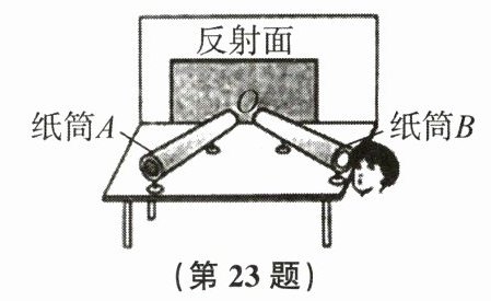 23. 兴趣小组的同学们利用如图所示的装置,探究反射声音的强弱与充当反射面的材料是否有关。他们将发声的闹铃置于纸筒A内,将充当反射面的材料置于O处,通过纸筒B倾听反射的铃声强弱。