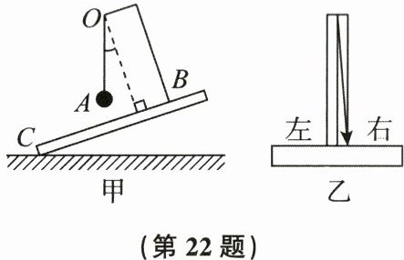 22. 如图甲所示,支杆OB固定在木板BC上,小球A通过细绳悬挂在杆端O处,利用此装置可以研究重力的方向。现从图甲中的位置开始缓慢增大木板与水平面的倾角,此过程中细绳OA的方向