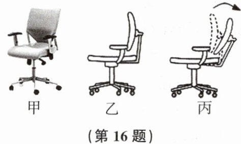 16. 现代家具越来越重视“人体工学”的设计,坐在如图甲所示的电脑椅上,当人向后靠时就比端坐在椅子上要舒服,如图乙、丙所示。如表所示中的数据为重500N的人使用电脑椅时的一些参数(g取10N/kg)。