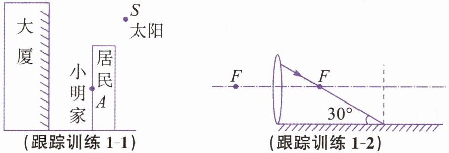 跟踪训练1-1 小明家的窗户正对着一幢大厦,大厦的镀膜玻璃外墙相当于平面镜,会把太阳光反射到小明家,这是一种光污染。请画出一条由太阳(S点)发出,经过镀膜玻璃外墙反射到小明家窗户(A点)的光线。