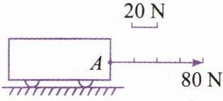 。这样一条带有箭头和标度的线段就把力的大小、方向和作用点都表示出来了。如图所示为对小车的A点作用一个大小为80N、水平向右的力。