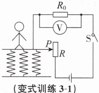 变式训练3-1 (2024秋·嘉兴市平湖市期末)如图所示为体重秤的工作原理图,电源电压恒定不变,体重显示表由电压表改装而成,定值电阻R₀= 20Ω,滑片P可以滑到电阻R的最下端。若该体重秤的测量范围为0~100kg,电压表变化范围为2~12V。下列说法中,正确的是 (
