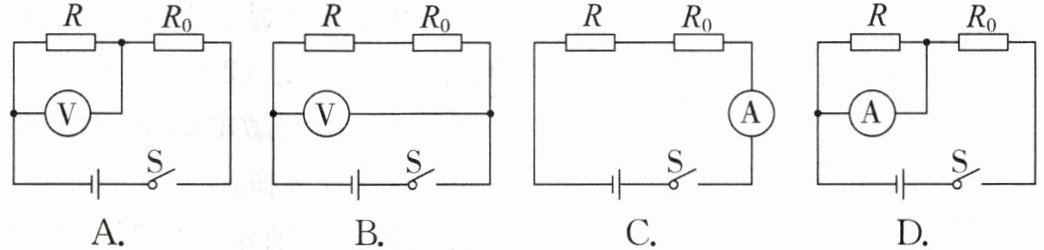 变式训练1-1 (2023秋·衢州市常山县期末)小科参加青少年科学素养大赛,设计了自动火灾报警器。报警器中有热敏电阻R和保护电阻R₀,其中R的阻值随温度升高而减小,当火灾发生时,温度升高,导致电表示数变大而触发报警装置。能实现上述功能的电路图是 (