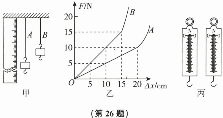 26. 某实验小组的同学对A、B两根长度相同粗细不同的橡皮筋进行研究,并做成橡皮筋测力计,将橡皮筋的一端固定,另一端悬挂钩码,如图甲所示,记录橡皮筋受到的拉力大小F和橡皮筋伸长量Δx,根据多组测量数据画出的图线如图乙所示。