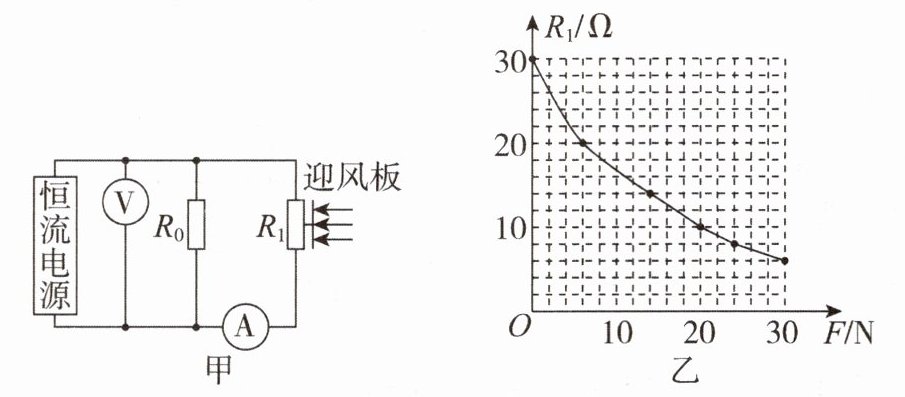 2. 每年夏季,浙江沿海易受到台风侵袭。某兴趣小组的同学设计了一个简易风速仪测量风速,内部原理电路图如图甲所示。恒流电源能始终提供大小恒定的电流。电流表量程为0~0.6A,定值电阻$R_{0}= 10Ω$。$R_{1}$为力敏电阻,其阻值随压力F变化如图乙所示。轻质迎风板受到的压力F会完全传递给$R_{1}$,压力F与风速关系如表所示。某次测量记录,电流表示数为0.4A,电压表示数为8V。