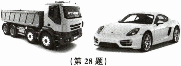 28. 如图所示的大卡车和小轿车都是交通工具,但它们有很多不同之处:①大卡车的车轮要比小轿车的车轮多且大;②大卡车的前挡风玻璃安装角度较直,而小轿车的前挡风玻璃安装角度则是稍倾斜的;③在高速公路上行驶时,大卡车的最高速度比小轿车要低。请你运用所学的知识解释上述不同之处的原因。