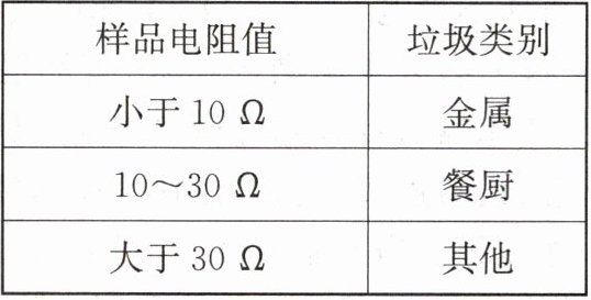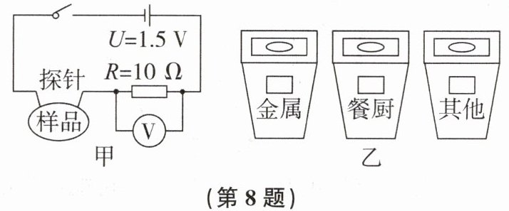 8. (2024秋·嘉兴市南湖区期末)为提高垃圾分类效率,小嘉设计了垃圾分类机器人,检测电路如图甲所示。它能通过机械手上的探针检测垃圾样品的电阻来识别其类别,各类垃圾样品的电阻参考值如表所示。在某次取样检测时,若电压表读数为1V,则应将该垃圾放入图乙中的