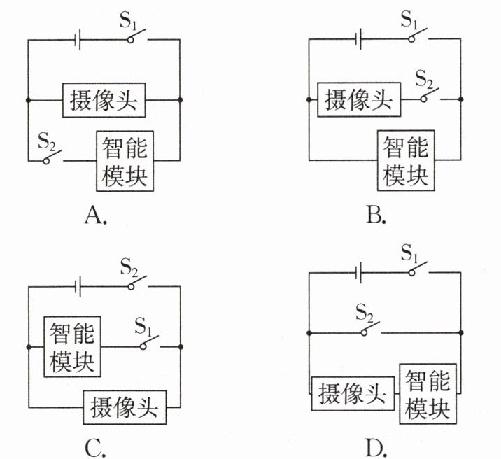 6. (2024秋·嘉兴市南湖区期末)智能镜子是一种集成了传感器、显示器等技术的智能家居产品,可以与健康设备连接,实时监测用户的健康指数,如心率、血压等。当人靠近镜子,开关$S_1$自动闭合,内部结构连通,摄像头工作检测用户脸上的信息,图像识别系统被唤醒后$S_2$自动闭合,智能模块启动,开始分析脸部信息并提供护肤建议。下列电路设计中,符合该要求的是 (