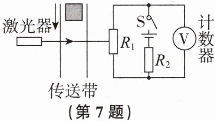 7. (2024秋·绍兴市嵊州市期末)某科技小组的同学们为快递公司设计了一套计数装置,电路如图所示。$R_1$为光敏电阻(当有光照射时电阻变小),激光被遮挡一次,计数器会自动计数一次(计数器可视为电压表$),R_2$为定值电阻。现闭合开关,计数装置正常工作。当激光被物体遮挡时,下列说法中,正确的是 (