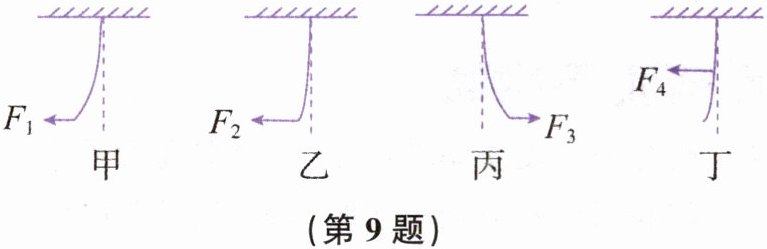 9. 小张做了一个实验,来验证力的三要素对力的作用效果的影响,如图所示,拉住一根锯条,使其发生图中四种形变($F_{1}= F_{3}= F_{4}>F_{2}$)。