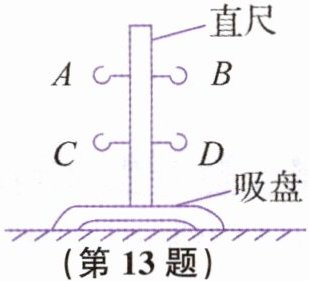 13. 如图所示为小科自制的探究力的三要素的装置,直尺与吸盘之间用胶水固定,直尺上固定有A、B、C、D四个挂钩。