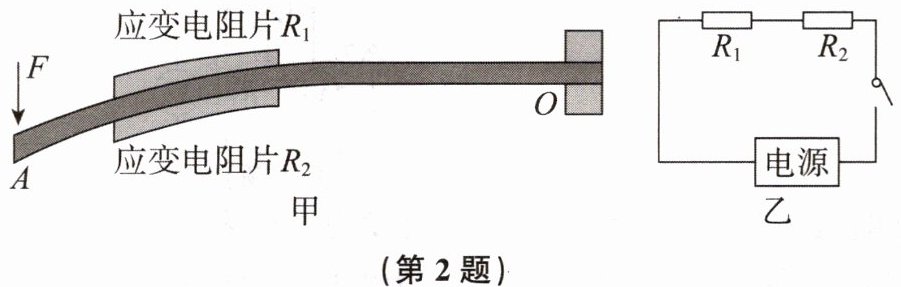 2. 如图甲所示为一种测力装置部分结构的示意图。横梁OA上下表面各贴一张完全一样的应变电阻片$R_1$和$R_2,R_1$和$R_2$串联在有恒定电流的电路中(如图乙所示)。在A端施加向下的力F,横梁向下弯曲$,R_1$被拉伸变长$,R_2$被压缩变短,根据它们两端电压的差值即可测量力F的大小。当横梁向下弯曲时,下列分析中,不正确的是( )
