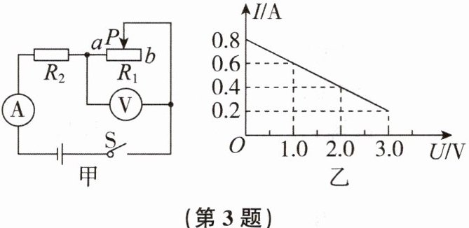 3. 在如图甲所示的电路中$,R_2$为定值电阻,电源电压不变,闭合开关S,将滑片P从b端移动到a端的过程中,电流表和电压表示数变化关系如图乙所示,则电源电压为