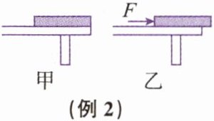 【例2】如图甲所示, 一块长木板放在水平桌面上, 现用一水平力 $F$ 向右缓慢地推木板, 使其一部分露出桌面(如图乙所示), 在推木板的过程中木板对桌面的压力 $F$、压强 $p$ 和摩擦力 $f$ 的变化情况是 (