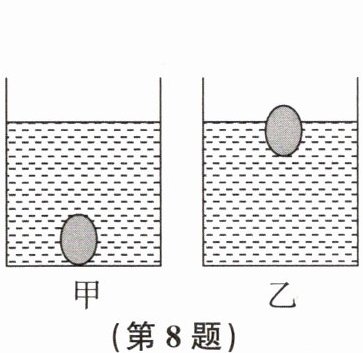 8. (2023秋·绍兴市柯桥区期末)将质量为55g,体积为$50cm^{3}$的鸡蛋放在盛有清水的玻璃杯里,鸡蛋沉入杯底(如图甲所示);逐渐将食盐溶解在水中,最终鸡蛋漂浮(如图乙所示)(忽略食盐对溶液体积的影响,g取10N/kg)。下列说法中,正确的是(