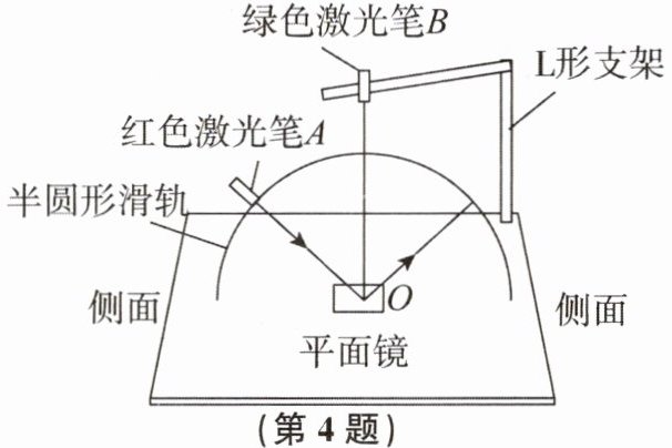4. 研究“光的反射定律”时,小科设计了如图所示的实验装置。半圆形滑轨固定在水平底座上,其圆心O处放置一小平面镜,红色激光笔A可以沿滑轨自由滑动,发射的激光始终对准圆心O点;L形支架上激光笔B发出绿色激光,该激光垂直于平面镜射入圆心O点。