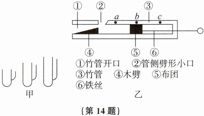 (2)小科在课余时间利用相同的科学原理制作了一个竹笛,如图乙所示,在竹管开口①处向管内吹气时,竹笛可以发出美妙的笛声,推拉铁丝⑥时,可以改变笛声的音调,则当布团⑤分别位于a、b、c三个位置时,竹笛发声音调最低的位置是
