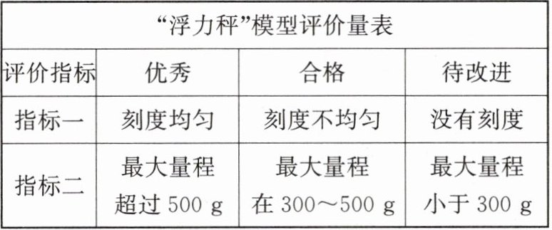 (3)如表所示为“浮力秤”模型评价量表。根据评价量表该小组制作的“浮力秤”指标一被评为“优秀”,指标二被评为“待改进”。为使指标二也达到“优秀”,请你提出一条合理的改进意见。