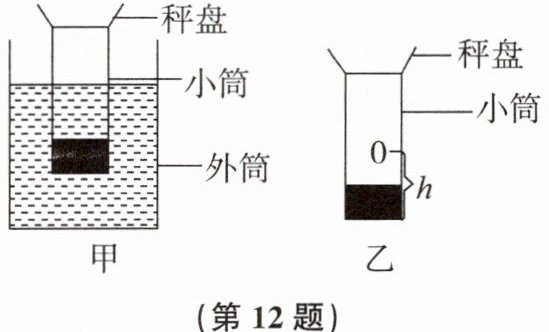 12. (2024秋·嘉兴市海盐县期末)某学习小组的同学自制了“浮力秤”,用来称量物体的质量,如图甲所示。“浮力秤”是由浮体和外筒构成的,浮体包括小筒和秤盘。已知小筒的底面积为$20cm^{2}$,可浸入水中的最大深度为20cm,外筒是足够高的透明大筒,容器壁厚度可忽略不计。($ρ_{水}= 1.0×10^{3}kg/m^{3}$,g取10N/kg)