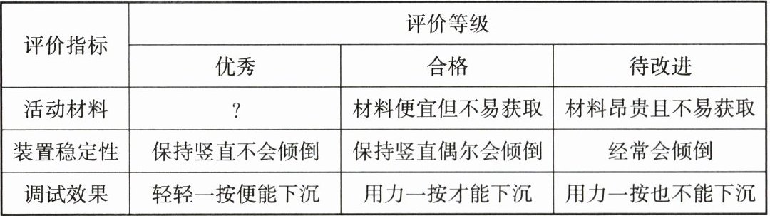 23. 某科学学习小组的同学们开展了“制作浮沉子”的项目活动,与老师讨论并一起制定了评价量表,如表所示。