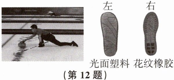 12. 在冬奥会冰壶比赛中,掷球运动员右脚穿“花纹橡胶”的“蹬冰鞋”,不断蹬地,左脚穿着“光面塑料”的“滑行鞋”,用力向前滑行。下列说法中,不正确的是 (