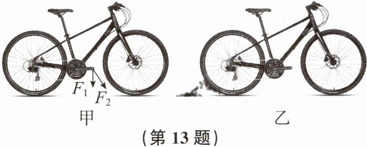 (2)小明在骑行过程中,先后用大小相同的力$F_{1}$、$F_{2}$踏脚踏板(如图甲所示),$F_{1}$能使脚踏板运动,而$F_{2}$却不能,这说明影响力的作用效果的因素是______。