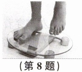 8. 如图所示为测量人体质量的电子秤,某同学双脚站在电子秤上时,显示屏上显示49.6kg,当他抬起一只脚时,显示屏的读数