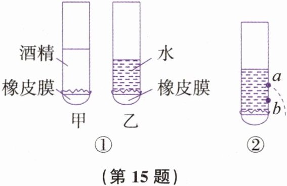 15. 探究“影响液体压强的因素”时,研究小组的同学们设计了如图①所示的装置进行实验,小组同学取两支相同的玻璃管,底部套上橡皮膜,分别在甲、乙玻璃管中倒入等质量的酒精和水。